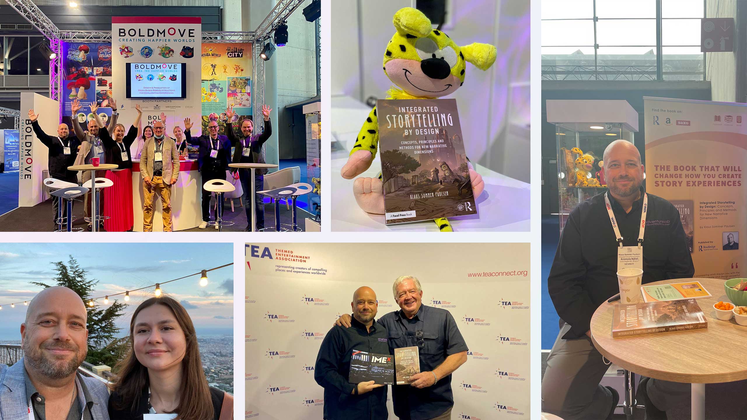 IAAPA Expo was an excellent opportunity to finally see old and new friends for the first time in a long while. The venue Fira Barcelona radiated with the energy of thousands of people eager to share creative ideas, look for new collaborations and “build happier worlds”. The quoted reference belongs to BoldMove, whom we joined this year as partners in BoldMove Nation. The team exhibited the Houba World and Houba City concepts and the dark ride TooMush with Smash and Reload, which were marvellously received by the public. Klaus Sommer Paulsen also presented his book “Integrated Storytelling by Design” during the daily sessions of “Meet&Greet” at the booth.