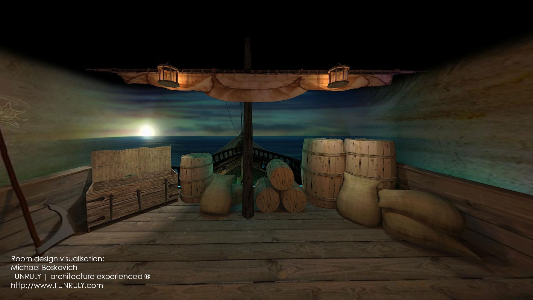 The 52m² room was transformed to resemble a ship deck, with a backdrop of a minimalised sunset over the sea. The room combined learning with sensory experience, gameplay, multimedia content and immersive design.